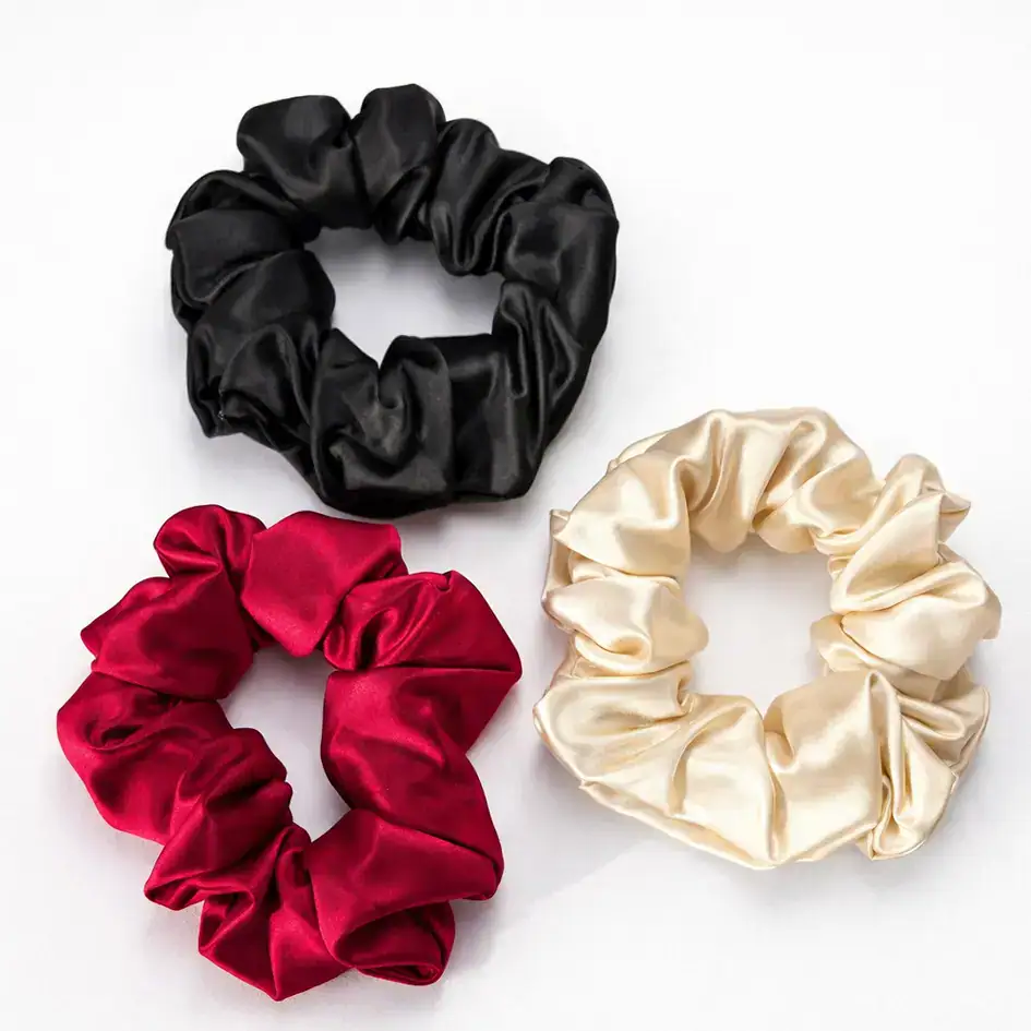 Natūralaus šilko gumelės, 3 vnt. Šampaninė, raudona ir juoda – toms, kurios mėgsta elegantišką kontrastą.